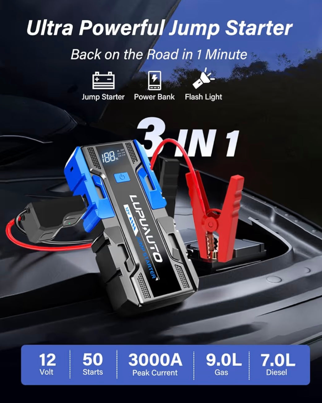 - More Powerful Booster: With a 12V 3000A peak current, the car jump starter can start the vehicles up to 9.0L Gas, 7.0L Diesel engines. The battery starter is equipped with a high performance force start function that helps you start depleted car batteries. 3*18W USB ports fast charge your multiple devices at the same time, such as cellphones, tablets, Kindles, or digital cameras. Suitable for car, truck, motorcycle, pickup and so on.