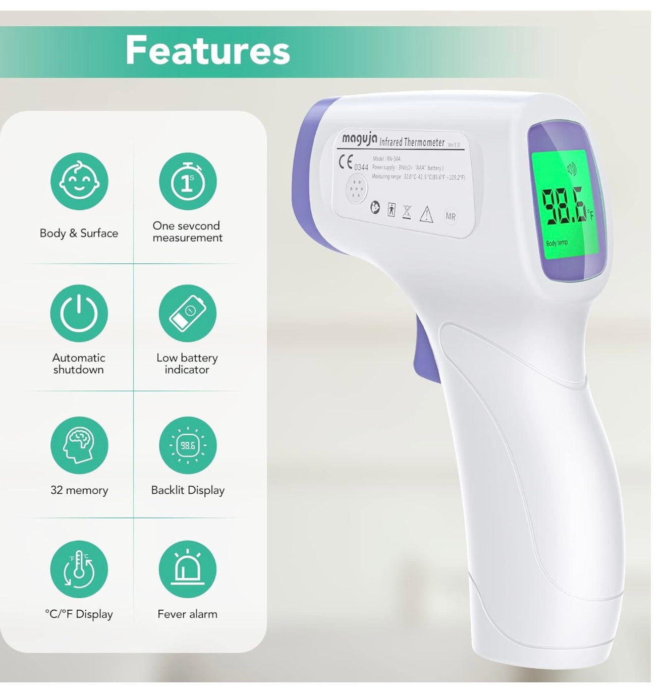 Multifunctional: The forehead thermometer is designed for all ages, adults, babies and elders. In addition to measuring forehead, it can also measure room, object, and liquids temperature. Great choice for families, nursery, hotels, school.