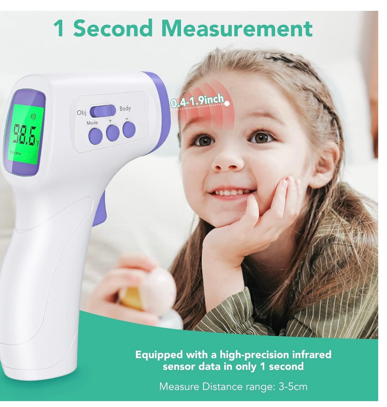 Fast & Accurate: Just faster, more reliable, precise, and hygienic. This temporal thermometer equipped with the advanced infrared technology and high precision sensor reads fast, it only takes 1 seconds to read the temperature. The accuracy of temperature measurement is within 0.1 ℃.